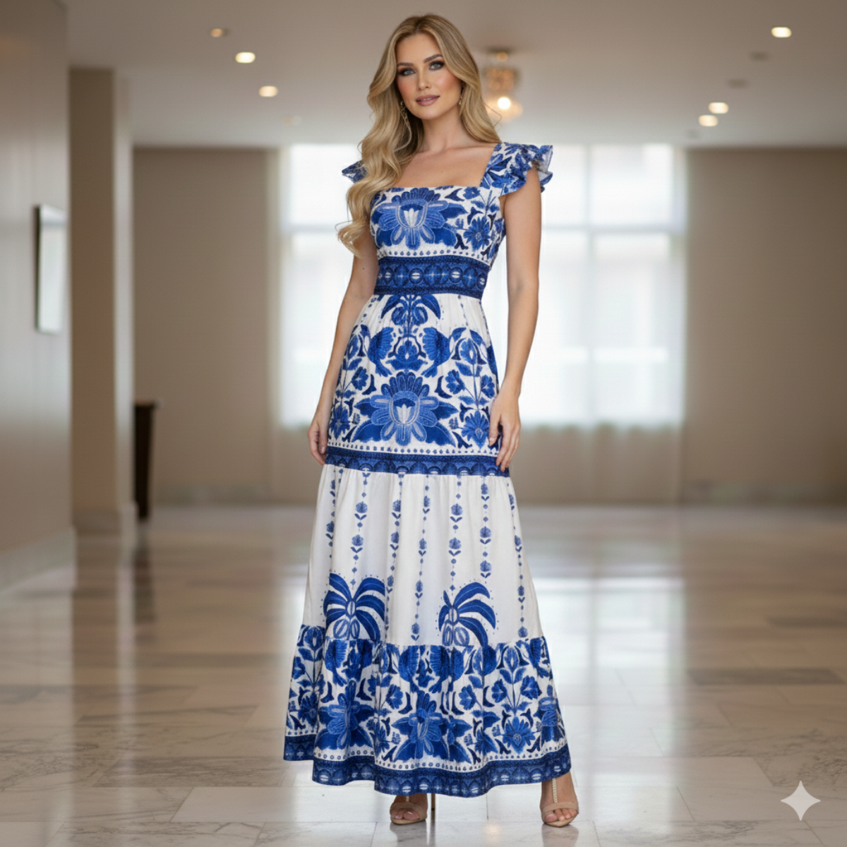 Vestido Longo Feminino Estampado Elegante Decote Quadrado Azul