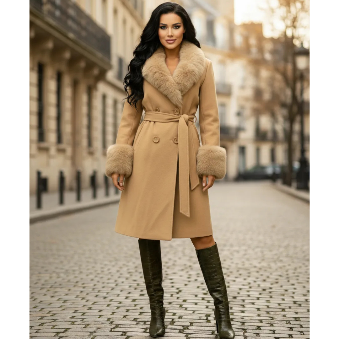 Sobretudo Lã Batida Feminino Luxuoso Gola de Pelo e Punhos Marrom Claro