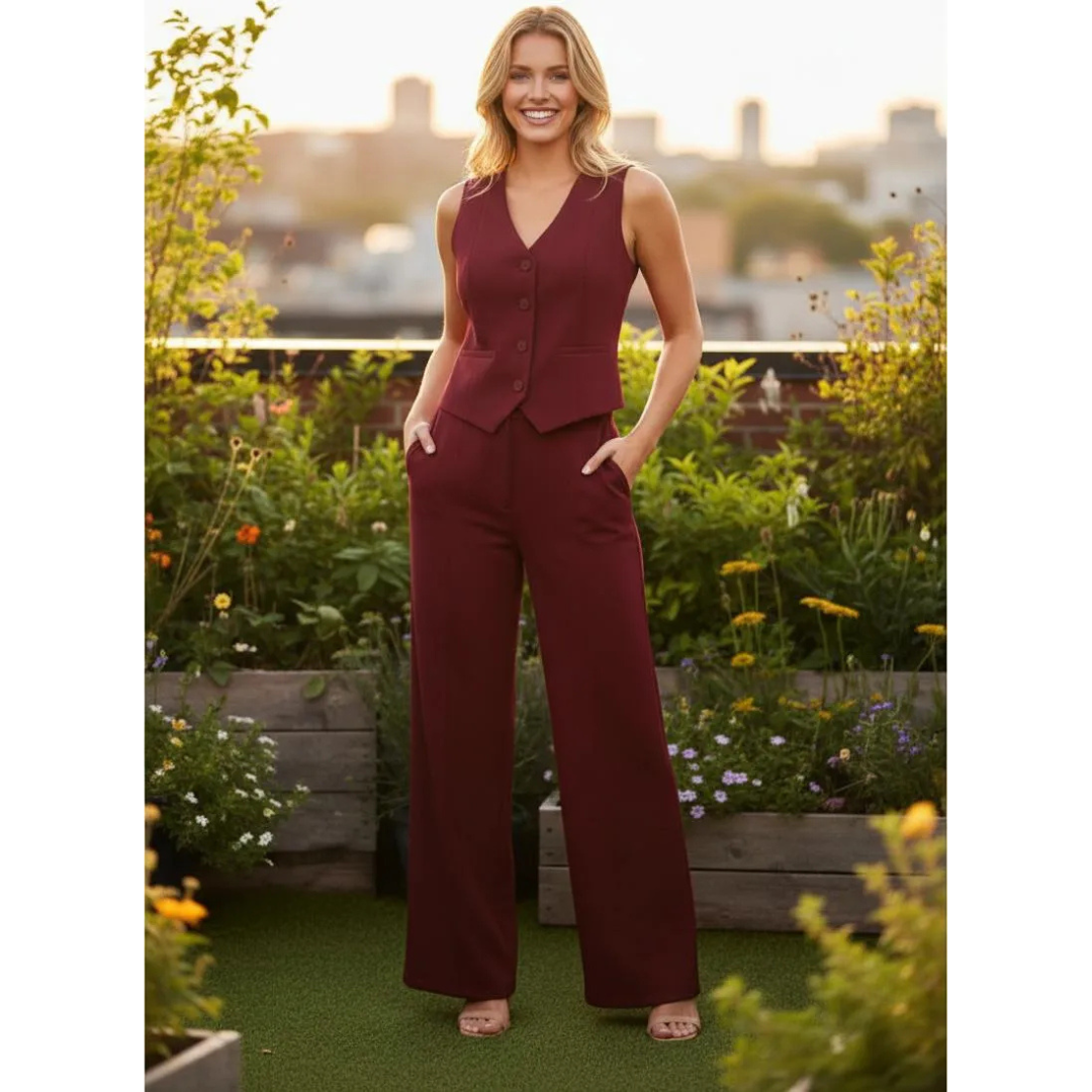 Conjunto Feminino Alfaiataria Colete + Calça Cintura Alta Bordô