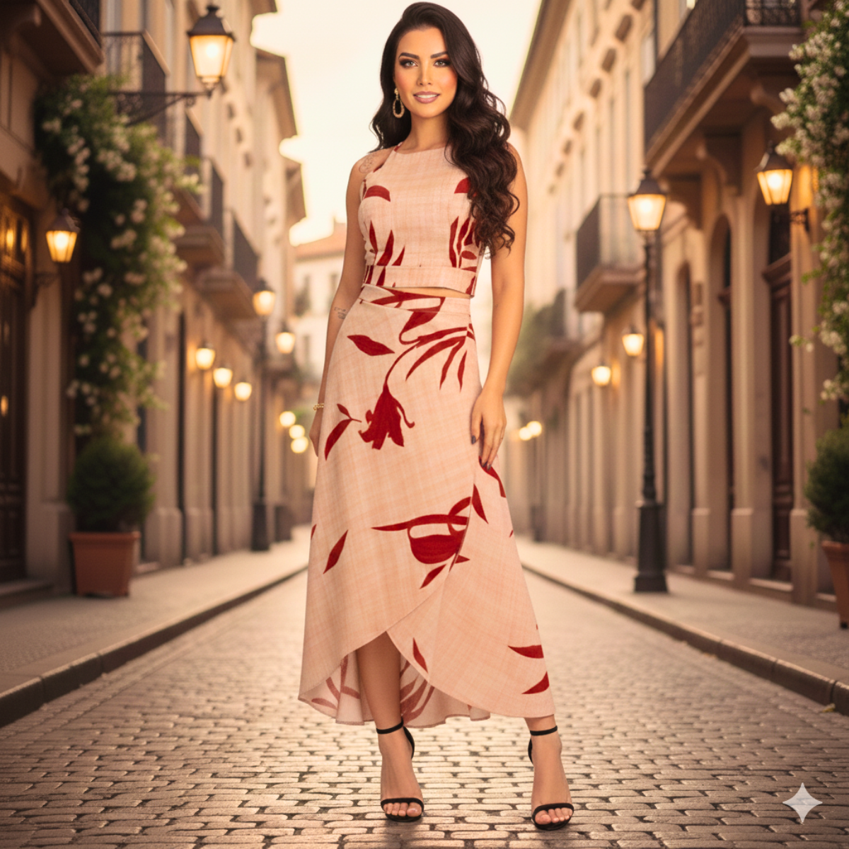 Composto por um top cropped com amarração nas costas e uma saia envelope midi, ele valoriza a silhueta e traz um caimento impecável para diversas ocasiões, desde passeios casuais até eventos mais sofisticados.